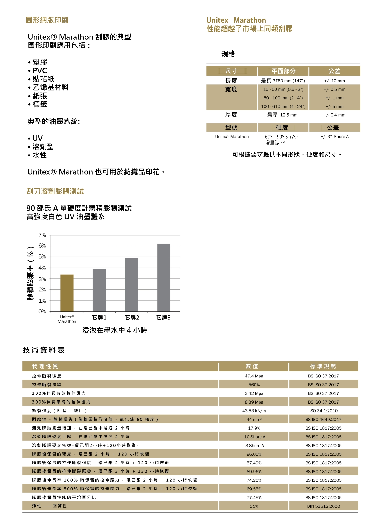 Unitex® Marathon 以極具競爭力的價格提供卓越的網版印刷性能和品質。 Unitex®Marathon 採用高級二苯甲烷二異氰酸酯 (MDI) 聚氨酯製成,可與多種圖形網版印刷系統相容,並具有卓越的抗降解性能,可抵禦現代印刷製程中常用的油墨、溶劑和單體的侵蝕。
