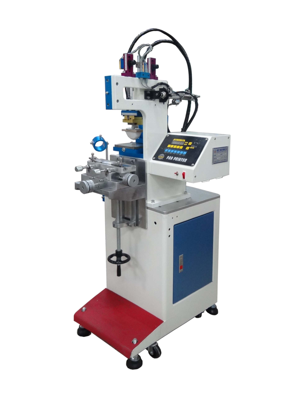 吹風機架 可固定於機台兩側,使用一般家用吹風機放在吹風機架上,可調整吹風機對準膠頭或印刷物印刷位置上,以加快印刷油墨乾燥速度。 | 熱風裝置: 鼓風機一台,電熱棒兩組,電子溫度控制器1組,熱風管一對二兩組。熱風溫度可控制,對準膠頭與被印物,以加快油墨乾燥速度。 | 除墨裝置: 清潔膠頭使用,可設定印幾下,除墨一次,除墨時,膠台自動移至膠頭下方,膠頭自動下壓以除去膠頭上的殘留油墨或粉塵。 | 除塵裝置: 被印物印刷前,可以使用此裝置將物件上的粉塵吹落,當物件靠近除塵裝置時,噴風自動啟動,遠離即停止。 | 十字雷射光標線器: 輔助對位使用,人工將物件基準點與十字雷射光線對齊並固定然後再印刷。 |