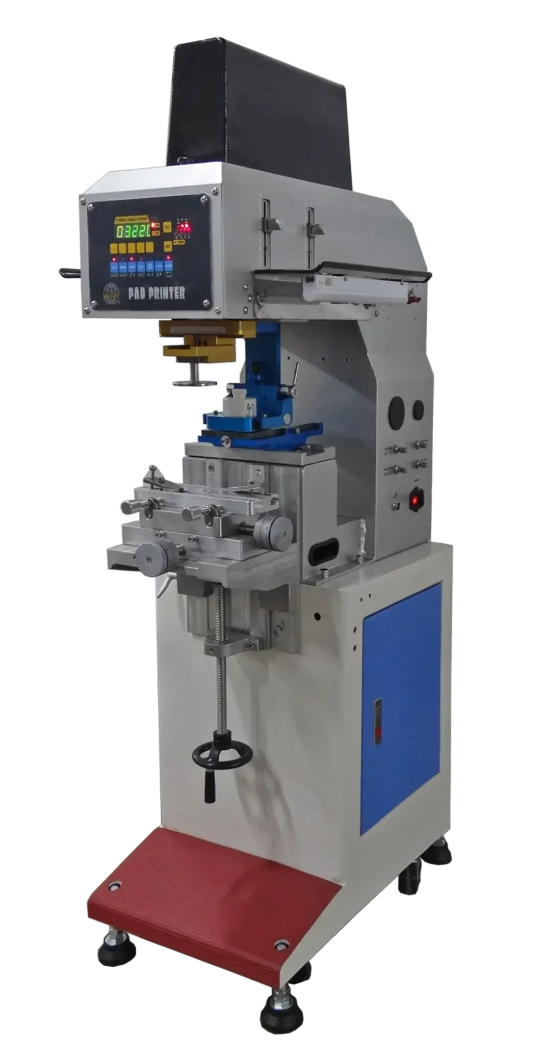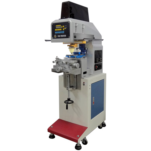 吹風機架 可固定於機台兩側,使用一般家用吹風機放在吹風機架上,可調整吹風機對準膠頭或印刷物印刷位置上,以加快印刷油墨乾燥速度。 | 熱風裝置: 鼓風機一台,電熱棒兩組,電子溫度控制器1組,熱風管一對二兩組。熱風溫度可控制,對準膠頭與被印物,以加快油墨乾燥速度。 | 除墨裝置: 清潔膠頭使用,可設定印幾下,除墨一次,除墨時,膠台自動移至膠頭下方,膠頭自動下壓以除去膠頭上的殘留油墨或粉塵。 | 除塵裝置: 被印物印刷前,可以使用此裝置將物件上的粉塵吹落,當物件靠近除塵裝置時,噴風自動啟動,遠離即停止。 | 十字雷射光標線器: 輔助對位使用,人工將物件基準點與十字雷射光線對齊並固定然後再印刷。 |